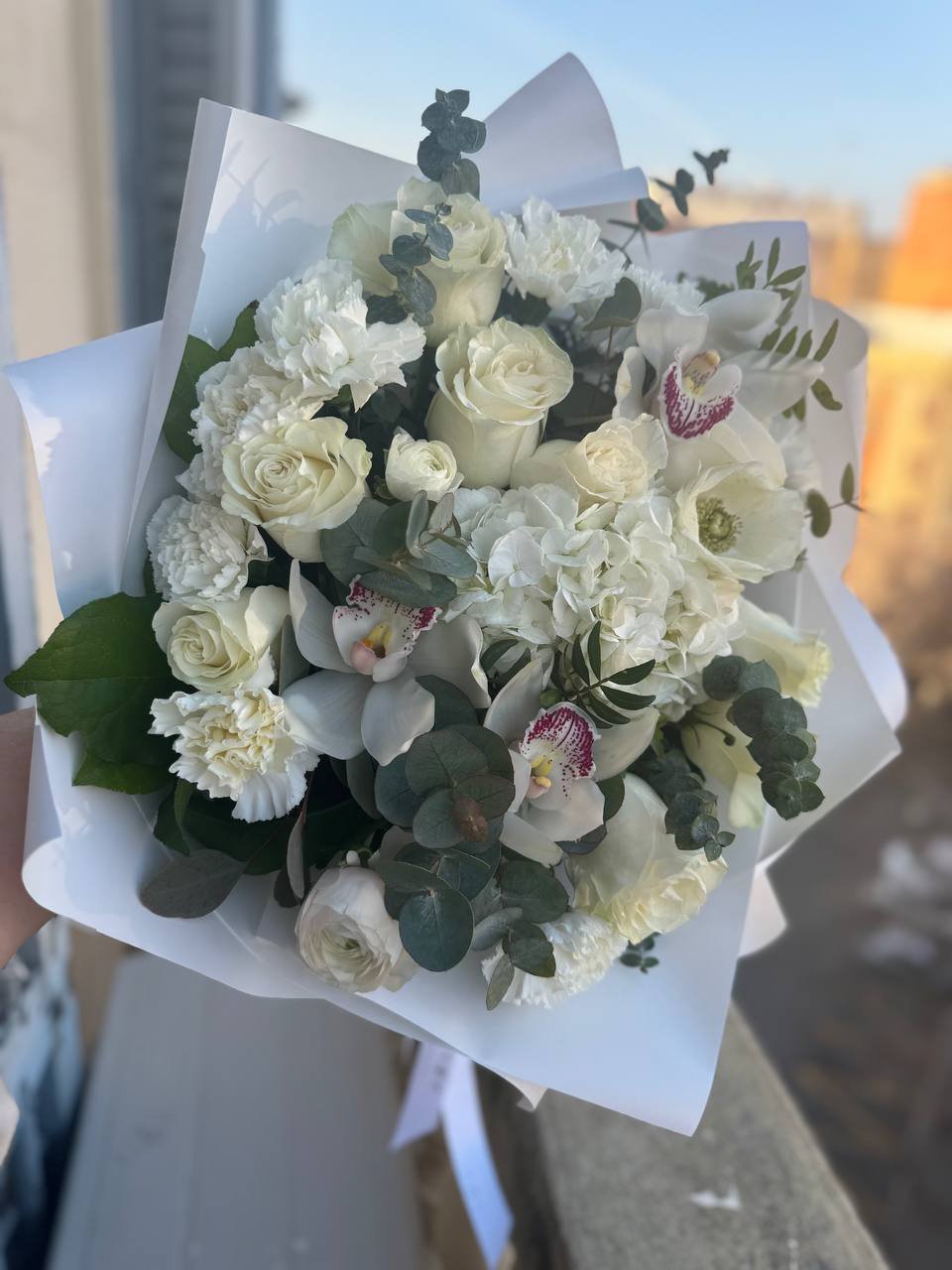 Bouquet of white flowers: orchids, roses, carnations.