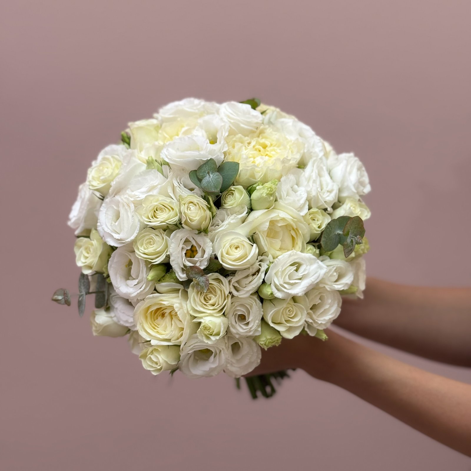 Bridal bouquet with peony rose, lisianthus, and garden rose