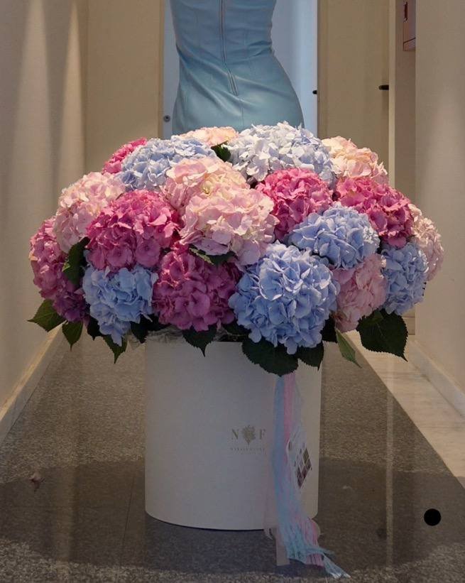 Gran ramo de inspiración en una caja: rosas, hortensias, claveles, rosas arbustivas.