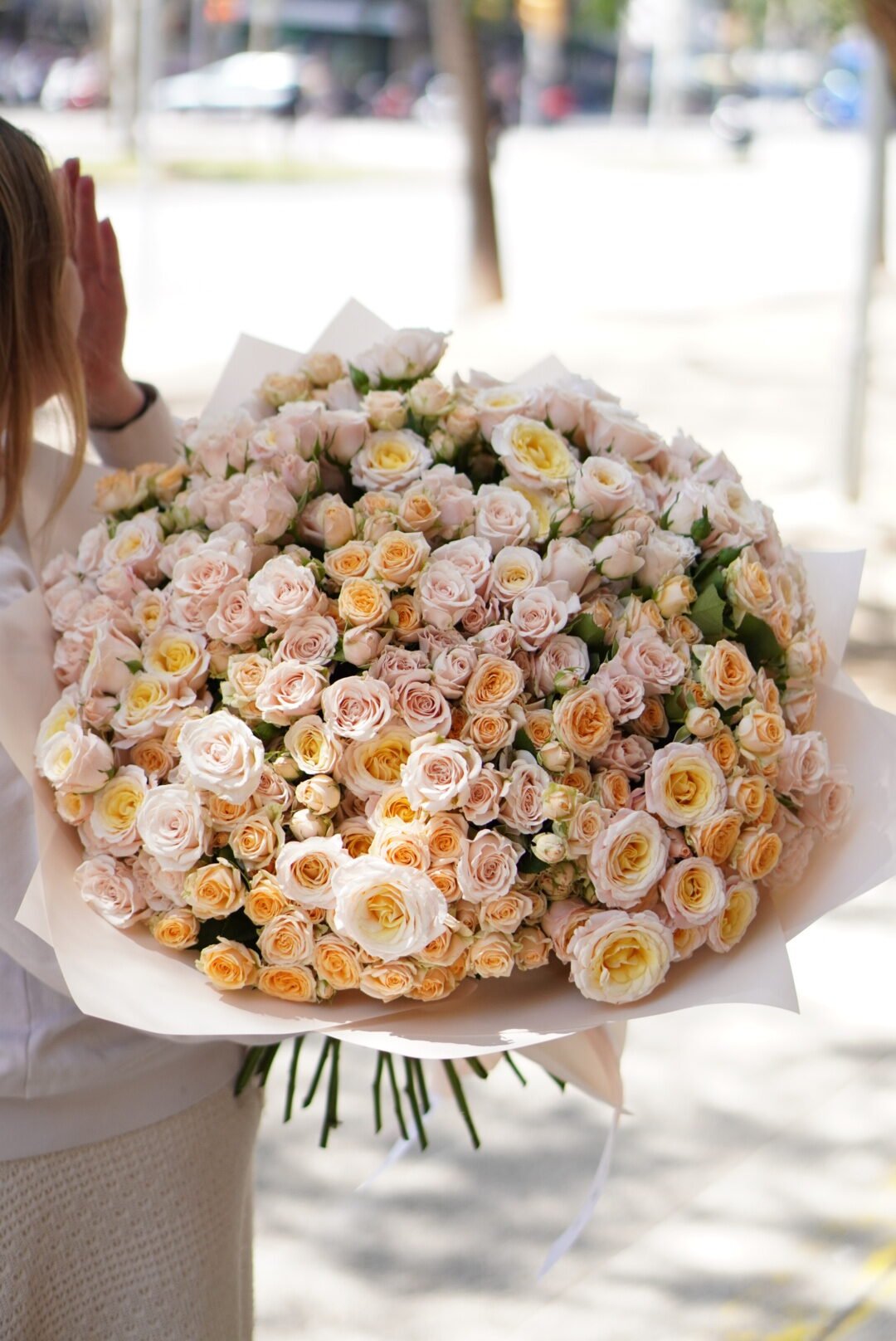 Ramo blanco puro de rosas y orquídeas: Rosa tipo peonía, phalaenopsis, clavel, hortensia